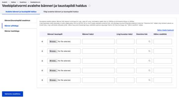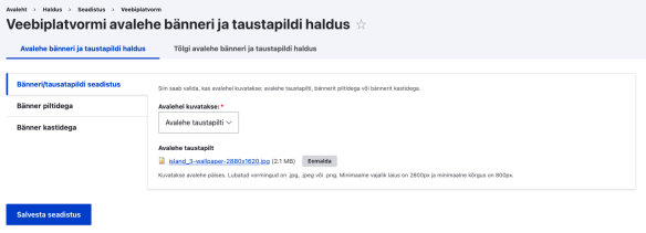 Haldusmenüü → Seadistus → Veebiplatvorm → Veebiplatvormi avalehe bänneri ja taustapildi haldus