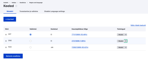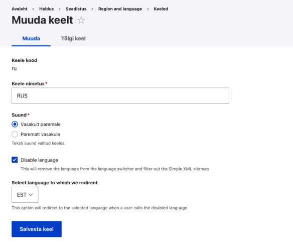 Keele keelamiseks vajuta märkeruudul "Disable language" ees ja salvesta.