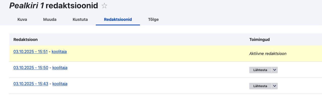 Redaktsiooni on võimalik lähtestada ja kustutada. Selleks vajuta rea lõpus, kas nupul lähtesta või vali nooleke alt kustuta.