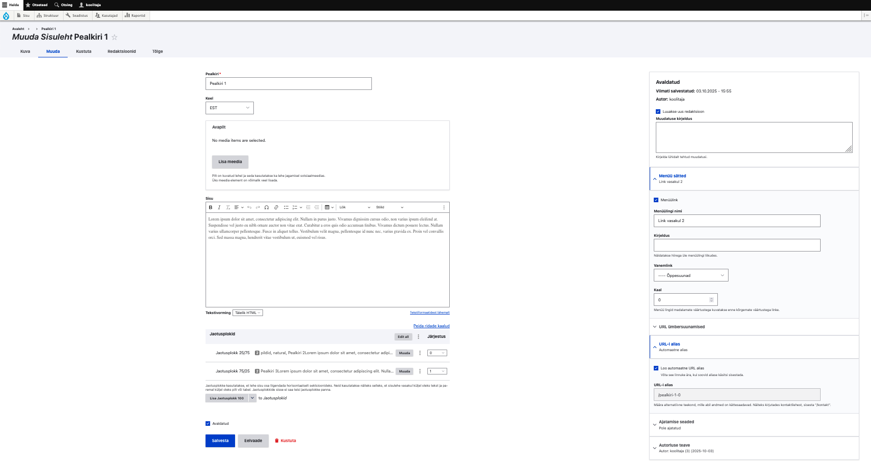 NB! soovitus on mitte tekitada navigatsiooni 0-tasemega URL aliasi. Nt kooliveeb.edu.ee/et aliasena kooliveeb.edu.ee/et/nädalamenüü lehele.