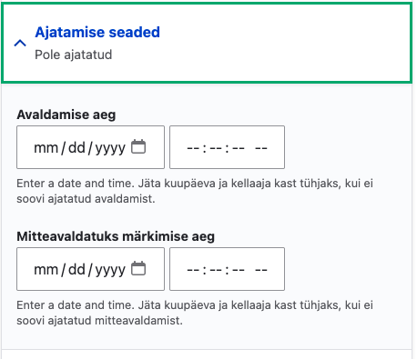 Sisu avaldamiseja mitte-avaldamise määramiseks saad määrata kindla aja. Selleks vajuta sisu loomisel desktopi vaates paremal Scheduling options akordionil ja määra avaldamise või mitte-avaldamise aeg.