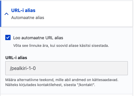 Url alias vaates on loodud automaatselt sisulehe pealkirja põhjal SEO sõbralik URL.