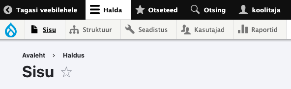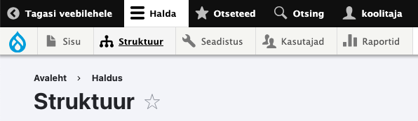 Stuktuuri koondvaadet näeb Haldusmenüü → Struktuur või kasutates URLi /admin/structure. Seal näha erinevad lisavalikud, kuid nendele veebilehe administraator rollil ligipääsu ei ole.